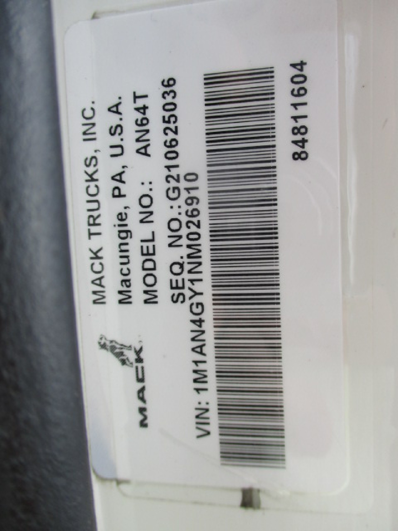 2022 MACK AN64T Description