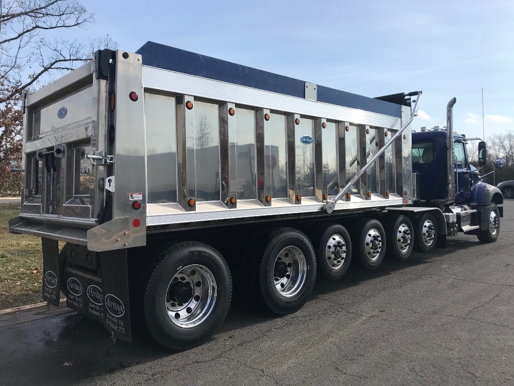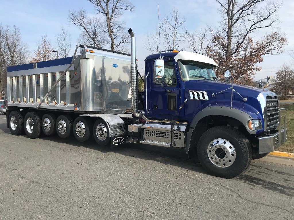 Ready to work 7-axle dump. Mack MP8 505hp/1,860lb.ft. torque. Fuller 13spd manual. Heavy double frame, 20k front, 46k rear, with four 10k lift axles. 20' aluminum body. 32' Virginia Bridge - 82,425lb Gross w/5% Sticker.